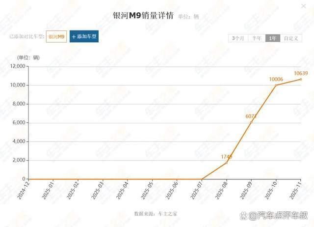 银河M9则更像是一位“价值破局者”。作为吉利银河系列的重磅车型,它一举将中大型六座新能源SUV的门槛拉入20万元以内。其17.38万元起的限时指导价公布时,市场反响热烈,预售24小时订单即突破4万台。从实际销量来看,银河M9自2025年9月上市后呈现稳步增长趋势,9月售出6071辆,10月突破万辆至10006辆,11月进一步增长至10639辆。虽然单月数据目前与钛7存在差距,但其重要意义在于,它成功开拓并激活了“平价豪华六座SUV”这一全新细分市场,让更多家庭能够以更合理的预算享受六座旗舰体验。