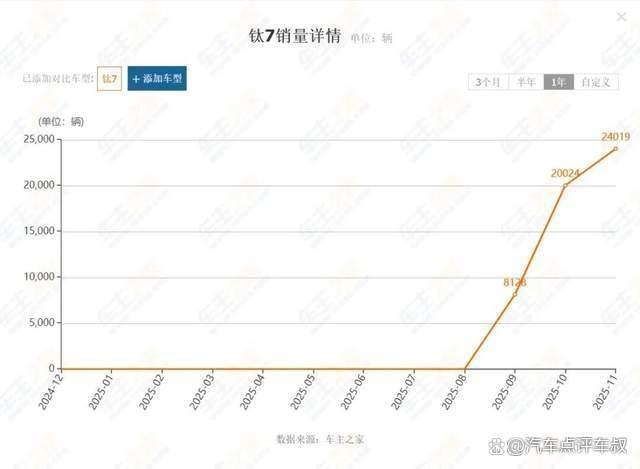 钛7堪称2025年下半年最引人注目的“销量黑马”。作为方程豹旗下的城市SUV,它以17.98万元的起售价,提供了近5米车长、2920mm轴距的大五座空间、强劲的插混动力以及不错的通过性。对于既钟爱硬朗造型和轻度越野能力,又注重家庭实用性和用车成本的用户来说,钛7的出现几乎填补了市场空白。数据显示,自2025年9月上市后,其销量迅速攀升,并在11月实现了单月24019辆的出色成绩。这不仅让它成为方盒子SUV品类的销量冠军,也在插电混动SUV市场中脱颖而出。